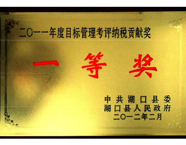 中共湖口縣委、湖口縣人民政府聯(lián)合授予“2011年度目標管理考評納稅貢獻獎一等獎”榮譽(yù)