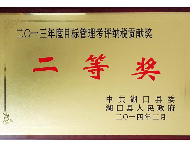 中共湖口縣委、湖口縣人民政府聯(lián)合授予“2013年度目標管理考評納稅貢獻獎二等獎”榮譽(yù)