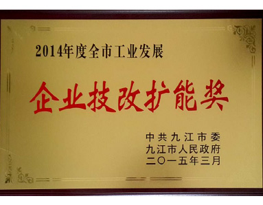 中共九江市委、九江市人民政府聯(lián)合授予“2014年度全市工業(yè)發(fā)展企業(yè)技改擴能獎”
