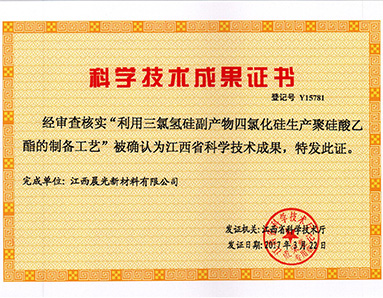 “利用三氯氫硅副產(chǎn)物四氯化硅生產(chǎn)聚硅酸乙酯的制備工藝”被江西省科學(xué)技術(shù)廳授予“江西省科學(xué)技術(shù)成果”榮譽(yù)