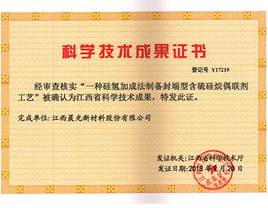 “一種硅氫加成法制備封端型含硫硅烷偶聯(lián)劑工藝”被江西省科學(xué)技術(shù)廳授予“江西省科學(xué)技術(shù)成果”榮譽(yù)